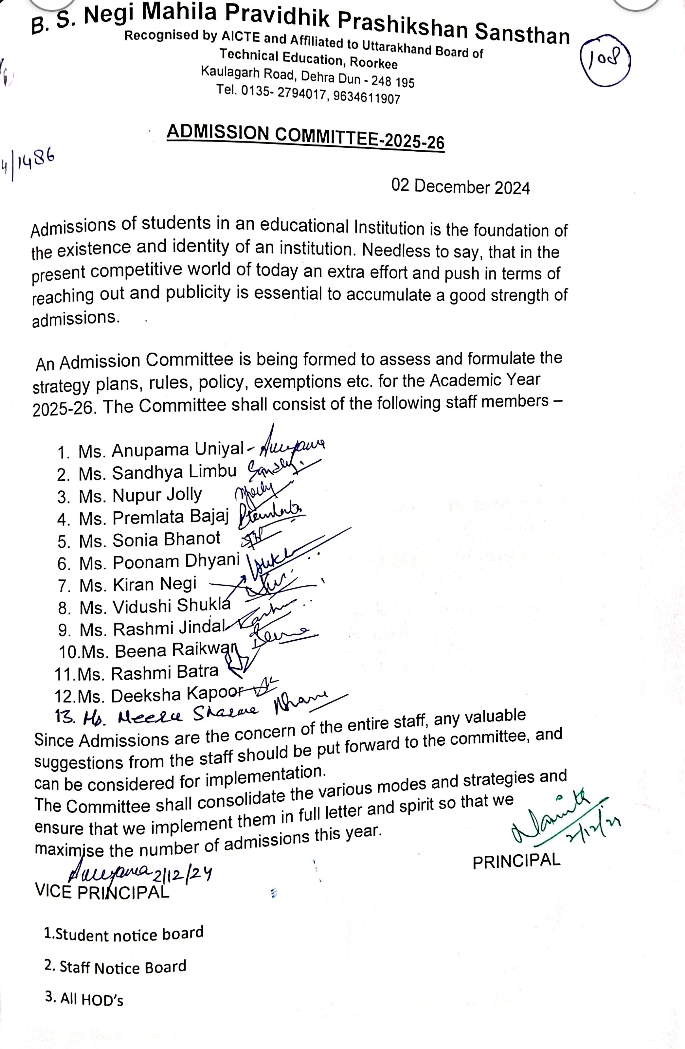 B.S. Negi Mahila Pravidhik Prashikshan Sansthan ONGC SOUTH CAMPUS, KAULAGARH ROAD, DEHRADUN, UTTARAKHAND, 248195 Telephone: 0135-2794017 Mobile: +9634611907 Email: bsnegimpps11@gmail.com |